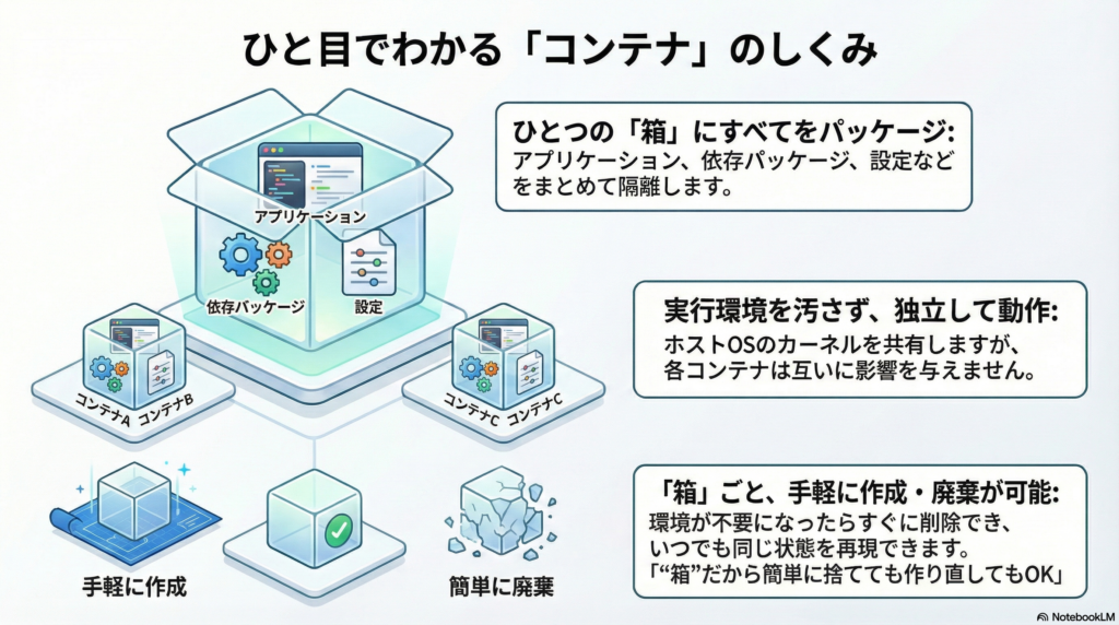 **「アプリを“箱(コンテナ)”に入れて動かせる仕組み」**です。
