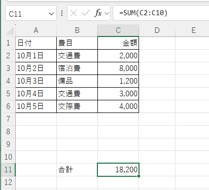 - C2〜C10の金額をすべて合計します。