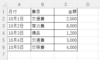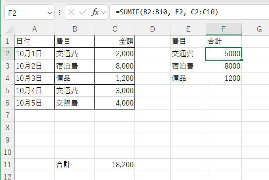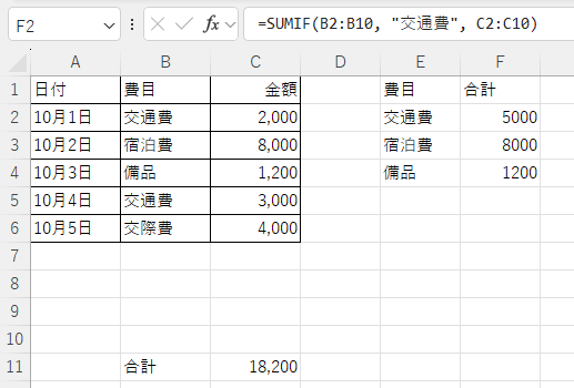 → 「費目が“交通費”の行」だけを合計します。