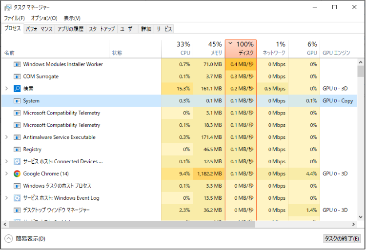 - Ctrl + Shift + Esc でタスクマネージャーを開いて、負荷が高いアプリを確認して終了しましょう。
